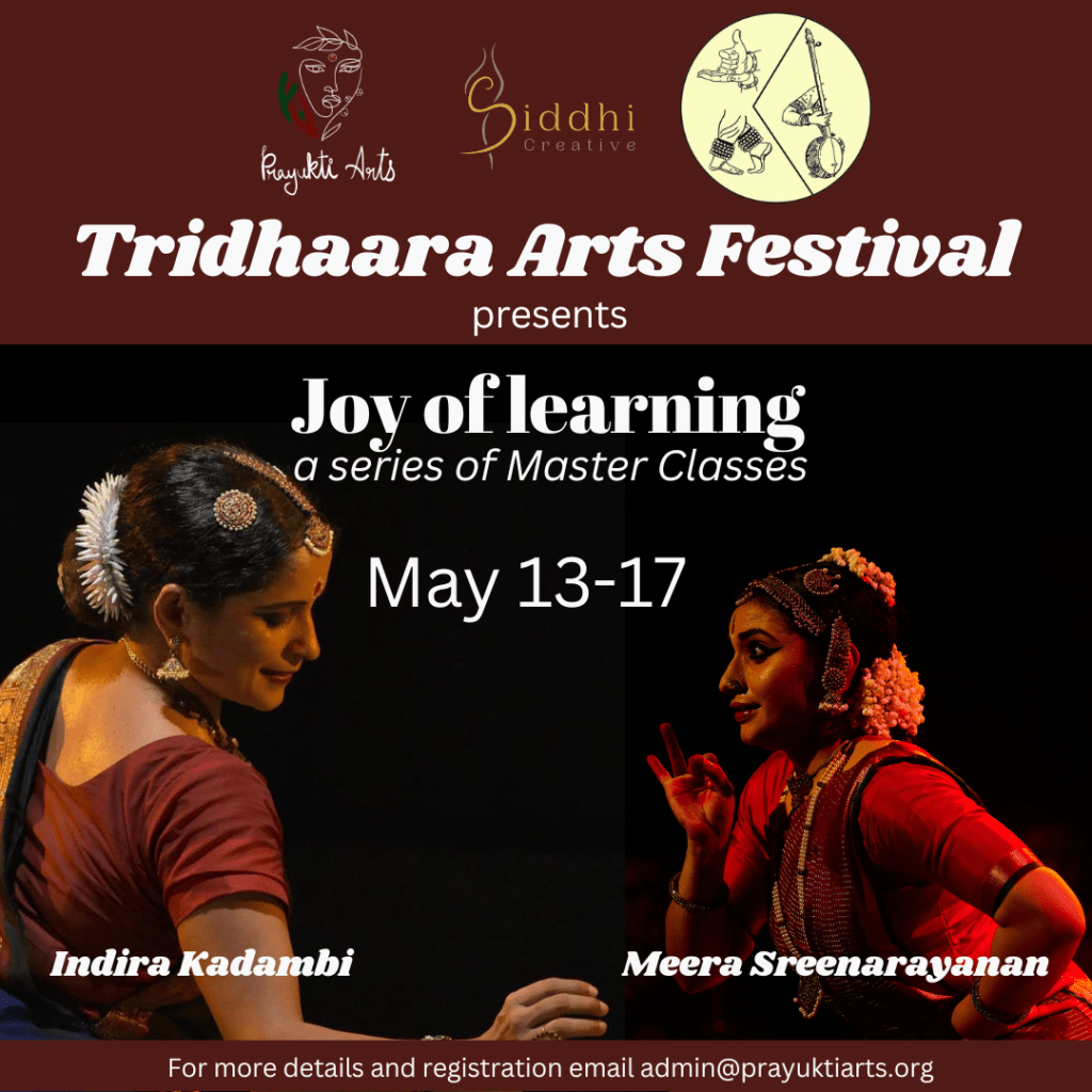Tridhaara Arts Festival is a collaborative initiative curated by Nitya Narasimhan (Prayukti Arts), Meenakshi Ganeshan (Kalaanjali Dance Company), and Surabhi Bharadwaj (Siddhi Creative).
